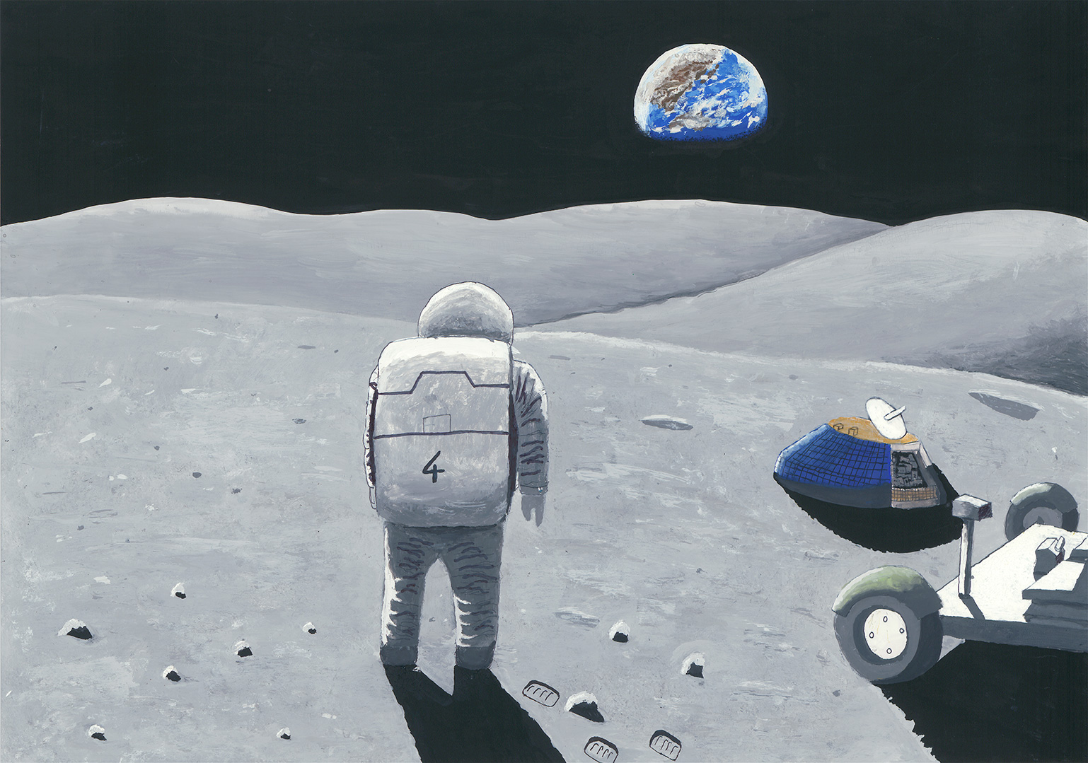 もし宇宙飛行士になれたらということで、ふと月面から見えた地球を見て黄昏ている自分を描いてみました。早く、誰でも宇宙に飛び出せる時代になってほしいです。