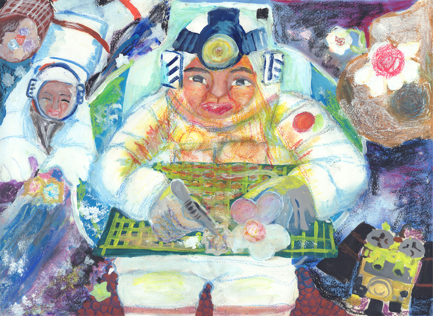 私がもし、宇宙飛行士になったら仲間といっしょに星の花の種の研究をしてみたいなと思い、かきました。絵の具だけでなく、クレヨンも色えんぴつもつかい色とりどりにしました。