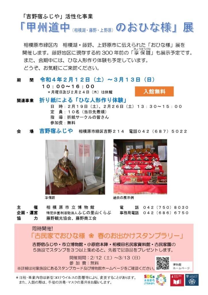 内 容:相模原市緑区内 相模湖・藤野、上野原市に伝えられた「おひな様」展を開催します。