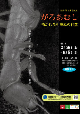 “ガロアムシ”ときいてすぐにその姿が思い浮かぶ人はあまりいません。それは私たちがふだん、ほとんど意識することがない、崩れた崖下の、地下のすき間に生きる虫だからです。絵本『がろあむし』は、そんな知られざる虫の生態を相模原市内の生息地で取材し、作られています。本展では、全ページにわたり納得するまで徹底的に観察した上で描かれた、細密な原画を公開します。また、作者である舘野鴻さんの制作の様子を、ラフ画や観察用具など豊富な資料から迫り、さらにガロアムシの他にも、絵本に登場している土壌動物を、写真家の吉田譲さんによる美しい生態写真で紹介します。