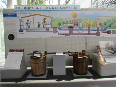 下水道処理の解説パネルや、下水道ができる前の下肥に使った道具などを展示しています。