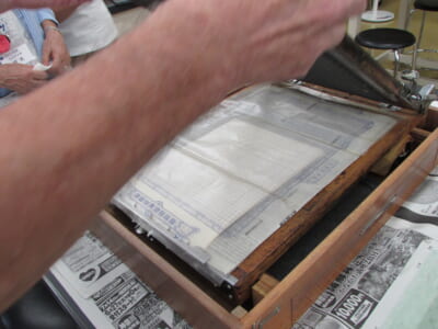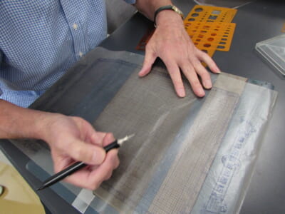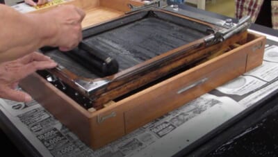 ❷ロウ原紙の下に紙を敷き、スクリーンにセットし、その上にインクを塗ったローラーを転がします。