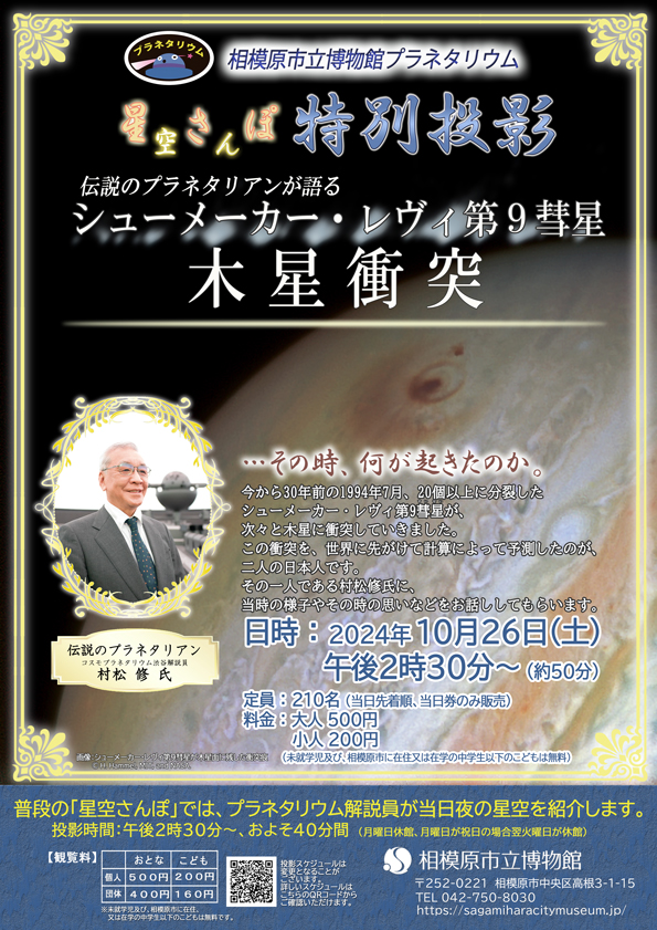 今から30年前の1994年7月、20個以上に分裂したシューメーカー・レヴィ第9彗星が次々と木星に衝突していきました。この衝突を、世界に先がけて計算によって予測したのが、二人の日本人です。その一人である村松 修さんに、当時の様子や、その時の思いなどをお話ししてもらいます。