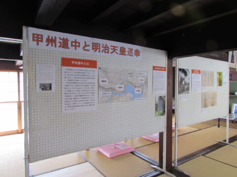 この展示は、令和6年度歴史分野博物館実習生が制作したもので、明治13(1880)年に明治天皇が訪れた市域の甲州道中について紹介しています。
