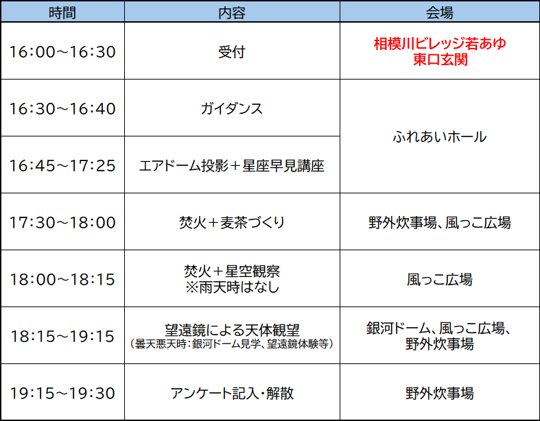 このイベントでは、相模川ビレッジ若あゆを会場に、直径5mエアドームを使用したプラネタリウムで当日の星空を学習した後、焚火を囲みながらゆったり星空を眺めたり、望遠鏡を使った天体観望(天文台と屋外に設置した望遠鏡などを使用)を行います。