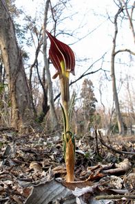 ふとまわりを見回すと、ミミガタテンナンショウは他の植物の動きなど我関せず、というようにすくっと伸びて花を咲かせていました。こちらは例年とあまり変わりないか、むしろちょっと早いくらいのタイミングです。