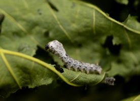 4回目の脱皮を終えると、いよいよ5齢(終齢)となります。5齢は7~8日で、このとき、カイコ1頭が一生に食べるクワの量(およそ25グラム)の8割以上を食べます。クワの葉をあげてもあげてもすぐに食べ尽くしてしまうので、担当者はしょっちゅう博物館の敷地内に植えられたクワの木へ葉を取りに行かなくてはいけません。他の職員から「たいへんだねえ」とねぎらわれるのもこの頃です。