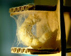 ふ化してから4週間弱、体がやや縮んで飴色に透き通ってきたカイコを、「まぶし」に移します。まぶしとは、ボール紙を4センチ角くらいの格子状に組んだもので、博物館では職員が自作したものを使っています。
