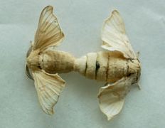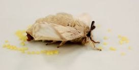 蚕種を生産するには、カイコを成虫にしなくてはいけません。蛹になったカイコは、繭の中で12日ほどすると羽化して成虫になります。成虫は、繭を固めている「のり」を溶かす酵素を口から出して、繭をほぐすようにして出てきます。