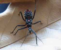 カメムシというと、植物の汁を吸うので農業害虫とされているものもありますが、サシガメの仲間は肉食性です。他の昆虫等を口吻で突き刺して、体液を吸うことによって餌をとっています。このため、不用意に掴むと刺されることもあります。