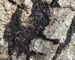 これは、ヨコヅナサシガメ(Agriosphodrus dohrni)というカメムシの一種の幼虫が、集団で越冬をしているところです。写真は、博物館の正面にあるクヌギの幹で撮影したものですが、桜の木で見られる事が多いようです。
