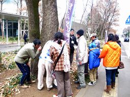 1月14日(土)のテーマは、「生き物たちの冬ごもり」です。博物館の樹木を代表する、入り口正面のクヌギの木が、今回のメインステージです。ここのごつごつした幹のすき間をよく見てみると…、何やら黒いかたまりがあります。参加者のみなさんには場所を教えずに「この幹のどこかにあるものがかたまっています」と言って探してもらいました。