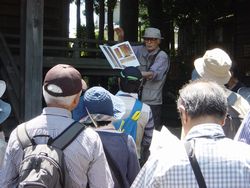 今回も担当学芸員である加藤がポイントごとに説明するとともに、特に地元在住で文化財保護課の文化財普及員も務めている調査会の会員も各所でさまざまなお話しをしました。また、全体で40名以上が歩くために、調査会会員はコースの誘導や車への注意を呼びかけるなど、安全で楽しめる探訪会になるように充分配慮しながら進めていました。