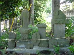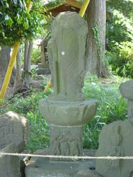 三猿が彫られた台座の上に乗る丸彫りの地蔵。首がないのが残念だが、注目される庚申塔の例として、武田久吉著『路傍の石仏』の中で紹介されている。