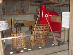 (2)多くの鍬やクルリボウを展示していた部分を縮小して畑作に用いる別の農具も展示し、併せてそれらの農具の使用している状況の写真を加える。