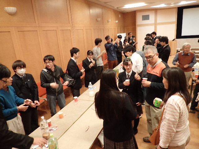 その試みの一環として、学校の発表を集中させている1日目の11月21日の口頭発表会終了後、情報交換会を開きました。この会には一つのルールがあります。それは、「同じ所属の人どうしが隣り合わせにならないこと」です。こうして専門のこと、学校のこと、進路のことなど話し合う中でほんとうの交流の芽が育ちます。