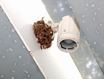 しかし今年、キアシナガバチが巣の場所に選んだのは、よりによって通路の真上。注意を呼びかける張り紙とともに、しばらくようすを見ていました。折しも小惑星探査機はやぶさのブームでたくさんの方がご来館される中、来館者とのトラブルもなく、ハチたちの子育ては順調に進みましたが、8月下旬に、館内へ迷い込んだハチが来館者を刺してしまう事態がおきました。そこで8月25日、これ以上の被害を出さないために巣を撤去しました。