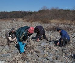1月。冬晴れのある日、緑区大島の相模川の河原にあるカワラノギクの保全地を訪れました。カワラノギクは、市内に自生する絶滅危惧植物です。種の保存のために、種子の採取と、越冬株(ロゼット株)の生育状況を調査するのです。この日は、博物館を拠点に活動する相模原植物調査会のみなさんと、丸石のすき間に生えるカワラノギクの株数を数えたり、同じような環境に生育するカワラハハコの分布状況を調査したりしました。