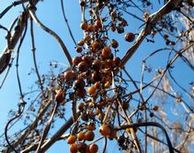 この時期も黄金色の光沢を失わないのは、ヘクソカズラの果実。人間にはひどい名前をつけられてしまいましたが、ヒヨドリなどの鳥たちにとっては大切な冬の食料です。