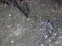 相模原地質研究会のメンバーとともに相模原市緑区佐野川地域を調査中に、黒っぽい表面に金色に光る粒がばら撒かれたような岩石を見つけました。 この金色の粒は、もちろん『金』ではなく、黄鉄鉱と呼ばれる鉱物です。黒っぽい岩石は千枚岩(せんまいがん)です。この千枚岩は、泥が固まってできた泥岩(でいがん)が、さらに圧力を受けて薄くはがれやすくなった岩石です。千枚岩は陣馬山周辺でよく見られます。