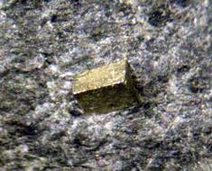 黄鉄鉱は薄い金色というか、真鍮(しんちゅう)色をした、立方体や5角12面体をした鉱物です。鉄(Fe)と硫黄(S)の化合物で、化学組成で表すとFeS2です。本物の金より色が薄く、きちんとした結晶の形になりやすいので、簡単に金と区別できます。陣馬山麓の黄鉄鉱は大きくても直径1 mmくらいで、非常に小さなものですが、きれいな立方体をしています。(地質担当:河尻清和)