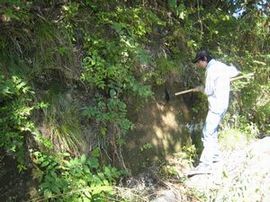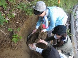 鎌を使って、地層を剥ぎ取り中
