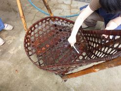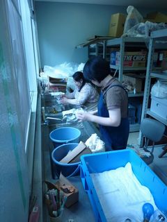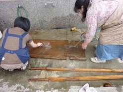所蔵元で永く大事に伝えられてきた品々も埃やクモの巣、カビ等の攻撃にさらされている状況が見受けられます。博物館に運ばれてくるのはそのままの場合が少なくありません。そこで、薬剤消毒(くん蒸)をかける前に資料のクリーニング作業できる限りのクリーニングを行う必要があります。モノの材質や状態によってはブラッシングや水洗いを済ませておくことにより他への害の波及を未然に防ぎ、くん蒸効果を高める算段です。資料との結びつきを強める第一歩と言えましょう。(歴史担当:土井永好)
