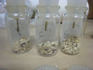 当館でも、これまで年間定期的なくん蒸消毒を実施しています。直近では残暑厳しく害虫の活動も活発な9月初めに今年度2回目の作業を行いました。手法上は「被覆くん蒸法」。ガス化した薬剤を、対象資料を集めシート等で密閉した場所に一定時間封入・浸透させるものです。効果は、ビンに詰めたサンプルのコクゾウムシの死滅確認で判断します。処理後はガスの蒸発拡散が早いため人体への影響はなく、収蔵庫格納等予定する次の作業を円滑に進めることができます。(歴史担当:土井永好)