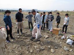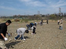 平成25年3月28日(木)、市内南区下溝の相模川で、カワラノギクの保全圃場(ほじょう)の種まきを行いました。この圃場は、河川管理者である神奈川県のご協力を得て造成され、光明学園相模原高校の理科研究部が育成にあたるものです。種子のまき方は、桂川・相模川流域協議会のみなさんに指導していただきました。理科研究部では在校生に加えて、今春卒業したOBも駆けつけてくれています。ゴミを拾ったあと、川砂と水を混ぜた種子塊(しゅしかい)を、砂礫地(されきち)の上にまんべんなくまいていきました。