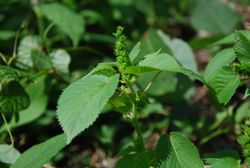 その後、相模原植物調査会の野外調査会の帰り、外来植物に明るい会員の方と博物館で鉢植えにしてあったその株を一緒に見て検討したところ、トウダイグサ科ではないか、との結論に至りました。さらにその方が、インターネット上で見つけた中米原産のAcalypha setosa A Rich(トウダイグサ科エノキグサ属)ではないかと連絡をくださったのです。写真を見るとほぼ間違いなく、英名Cuban copperleafというところまでわかりましたが、日本名がありません。つまり、まだ日本では確認されていない外来植物の可能性が高まりました。
