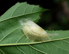 写真1 クワの葉裏についていたクワコの繭