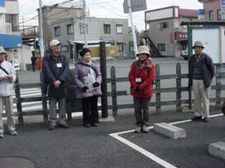 マップ作成のためのフィールドワークはもちろん会員が歩いたものですが、民俗探訪会では「広報さがみはら」や博物館のホームページで会員以外の市民の皆様からの参加者を募集し、当日は平日の午前中にもかかわらず24名の方のご参加がありました。実際に南部ルートのマップを参加者に配布してそのコースを歩いていき、ポイントごとに学芸員のみならず、中心になって作成に当たった会員も説明をしました。そして、そのほかの会員も開始や終了の際の挨拶のほか、どうしても長くなる歩行の誘導や交通安全への配慮など、事故なくスムーズに進行できるように気を配り、歩いている途中には参加者に気軽に声を掛けるなど、和やかな雰囲気の中で探訪会を実施することができました。