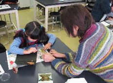 調査会では、ふだんはかなり専門的な植物調査を行っています。市域を中心に野生植物を採集し、押し葉標本にして採集データとともに博物館へ納めるという地道な作業ですが、これには高度な専門性と技術が要求されます。でも、みなさんがこうした活動に加わったきっかけは、例外なく「植物が好きだから」です。落ち葉の美しさ、形の楽しさをいちばんよく知っているのも、調査会のみなさんです。楽しそうに作業する参加者を見つめるやさしいまなざしがあるからこそ、こうしたワークショップが成り立っています。(生物担当 秋山)