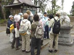 民俗探訪会では、当館学芸員である加藤とともに調査会の会員が地域を案内しますが、毎回、「なるべく地元に住んでいる方でないと知らないこと」をテーマとして進めています。その点からも、今回のコースは相原の歴史をさぐる会員の「一押しのコース」であり、例えば、古くは多摩丘陵の尾根が武蔵・相模の国境(くにざかい)とされていましたが、文禄三年(1594)の検地で田倉川(高座川)に代えられ、以来、川の北を武蔵に編入して相模との境になったため境川と呼ばれるようになったとされることや、町田市の多摩丘陵尾根道に、天保10年(1839)の建立で、相模原側の相原村の小川家に関係する出羽三山供養塔(※山形県の月山・湯殿山・羽黒山の信仰に関係する石仏など、町田・相模原の両相原地区を含めた今回のコースもそうした観点から設定されたものです。また、相模原に入ってからは、普段は気がつきにくいものでも、言い伝えのある石仏や当麻の無量光寺と係わりがある水田跡など、まさに地元で活動する会の会員ならではの興味深い説明がありました。参加者からも、丘陵に上る坂を歩くのは少し大変だったけれどもほとんど行ったことがない所を歩けて良かった、また散歩コースでよく通るのに今までは全然知らなかったことがよく分かったなどの感想をいただき、好評のうちに終了することができました。