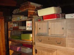 蔵の中にはさまざまなものが収納されており、その中でも大量にあったのが衣類などの身に まとうものです。このほかには、鍋や釜・食器などの日常の生活用具や、節供人形・結納目録等のハレの 機会に用いられたものなども見られます。蔵に置いてある道具の出し入れや蔵の鍵の管理は、主に昭和9 年(1934)に当家に嫁いだ福田利子さん(明治42年生)が平成13年(2001)に91歳で亡くなるまで行っ ていたとのことで、昭和22年(1947)生まれの現在の御当主の両親や兄弟、叔父叔母が使用した頃のも のが多く、それ以降もある程度の時期までは出し入れをしていたようですが、しだいにそのままになっ て現在に至りました。なお、蔵だけでなく、履物類や神仏の御札や掛け軸など、一部は主屋にあるもの も寄贈されることになっています。