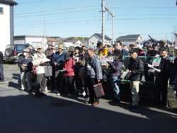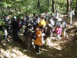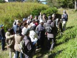 今回も「広報さがみはら」や博物館のホームページで会員以外の市民の皆様からの参加者を募集し、これまでは定員内(30名)の申し込みだったのが52名の方からの応募があり、野外を数時間に渡って歩くという安全性の観点から抽選となりました。当日は、31名の参加者と会員10名に加え、博物館長や麻溝まちづくりセンターの職員、平成25年度から「博物館ネットワーク」システム作りで博物館と協働事業を行っている神奈川工科大学の白井研究室の方々も参加され、JR相模線の原当麻駅から下溝駅まで、約3時間のコースを歩きました。