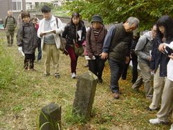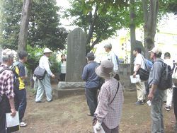 今回も担当学芸員である加藤が説明するとともに、調査会の会員も現在は新田稲荷神社に祀られている旧陸軍の兵器学校にあった神社や、龍像寺境内の旗本岡野家の墓所についてのお話しをしました。また、全体で30名以上が歩くために交通面には特に気を使い、調査会会員は誘導や車への注意を呼びかけるなど、安全で楽しめる探訪会になるように配慮しながら進めていきました。