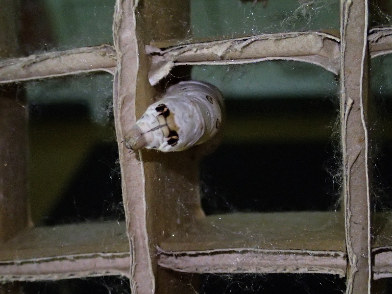 上蔟(じょうぞく)です。熟蚕=糸を吐き始めるさい、蔟(まぶし=まゆを作るます)の中にお移りいただく時が近づいております。ダンボールで作った50コほどのますの中に一個ずつそっと入れてさし上げました。個々で好みがあるため多目のますが必要と知り手作りしました。なるほど見ているとあちこちのますに移動、同じますに入っている仲良しもいます。はね繭(糸のつむげないまゆ)になるからと分けました。蔟に入れてから2日、ほとんどがまゆを立派に作り始めました。博物館にお帰りいただく時が来たのです。18日間ご逗留ありがとうございました。一生の思い出です。