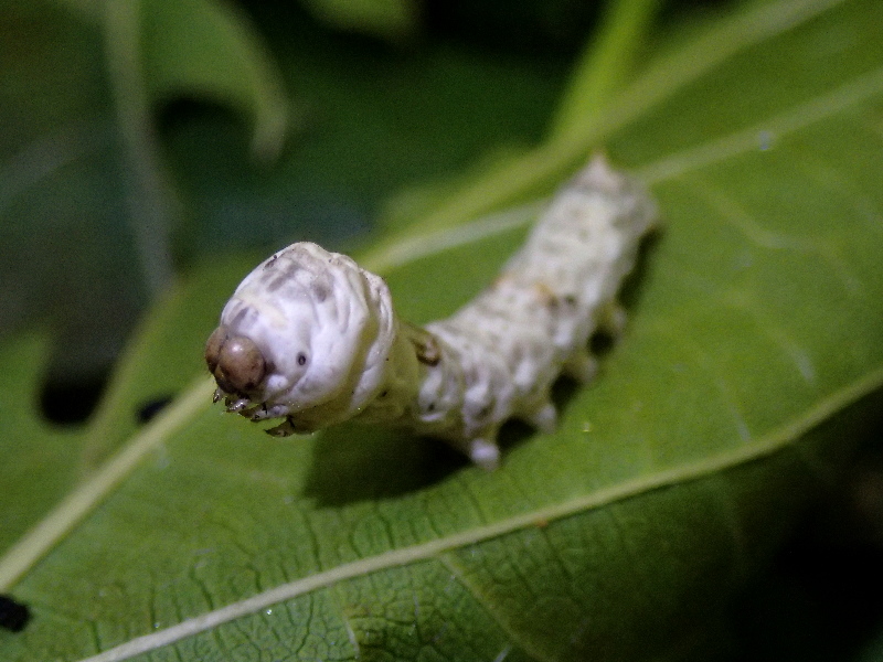 1㎝にも満たなかった御蚕様、2週間後には7㎝以上、人の中指ほどにも成長し精密機械のごとく食べつづけます。16日目真夜中大量の桑の葉をさし上げようとお宿をのぞくとどうでしょう。3時間前にさし上げた葉っぱは食べず、全員その葉の上に立ち並んでいます。32頭が一斉に!びっくりです。どうしました?何がありましたか?と見回しました。それでも新しい葉をそっと置きました。10分後おそるおそる見ると又全員立って頭だけキョロキョロ!