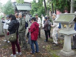 今回も担当学芸員である加藤が説明するとともに、調査会の会員も現在は新田稲荷神社に祀られている旧陸軍の兵器学校にあった神社や、龍像寺境内の旗本岡野家の墓所についてのお話しをしました。また、全体で30名以上が歩くために交通面には特に気を使い、調査会会員は誘導や車への注意を呼びかけるなど、安全で楽しめる探訪会になるように配慮しながら進めていきました。