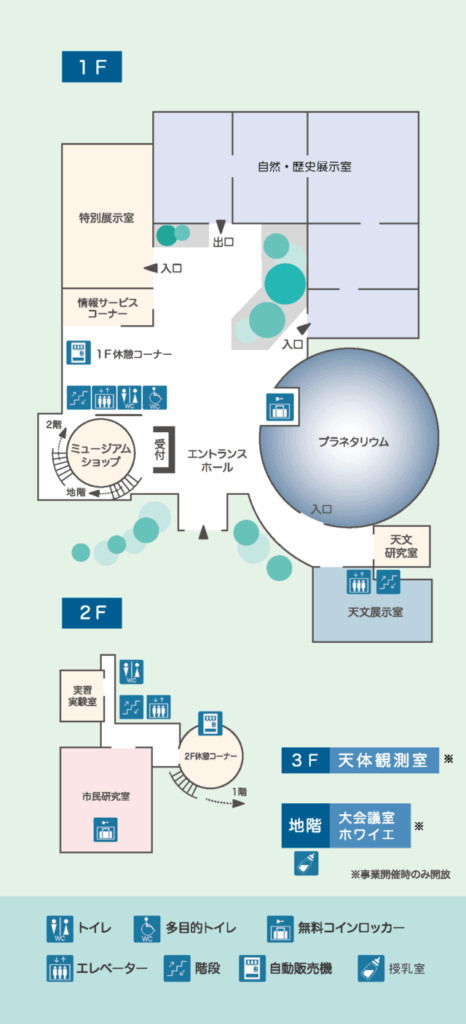 | 1階に1つ | 1階女子トイレ、地下1階男子トイレ | あり | 4台 | 受付にあります。 | 自然・歴史展示室入口脇にあります。 | 3台 ご利用の際は受付にお申し出下さい。 |