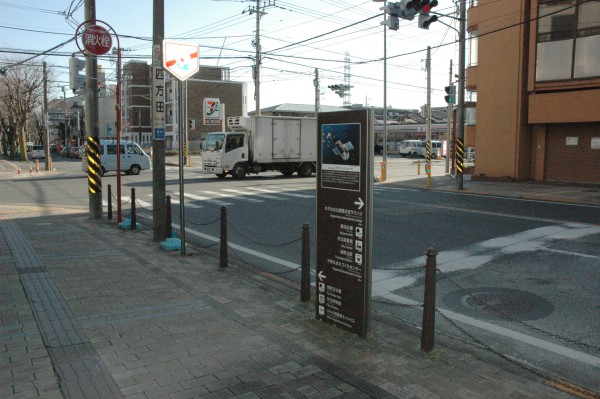 歩道橋か、横断歩道で反対側に  わたります。これまでと同じ方向にすこし進むと、案内看板⑤(写真の矢印の先)があります。博物館まで550mです。