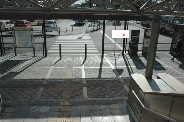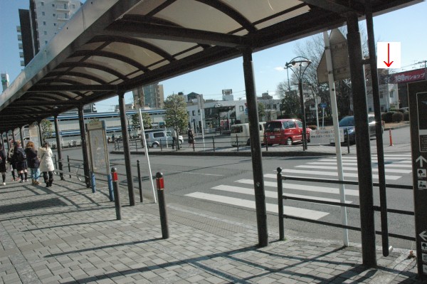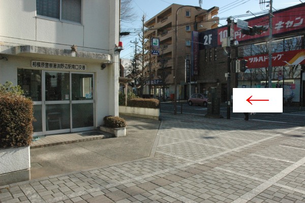 ロータリーの向こう側に、白くて四角い「淵野辺駅南口交番」 (写真内の矢印)があります。安全のため、ロータリーを左にぐるっとまわって交番前に行きます。(写真の左方向へ)