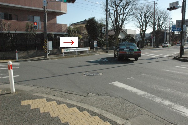 交番(写真の左)の先に広がる道路を、下図の矢印の方向へ3分ほど歩きます。