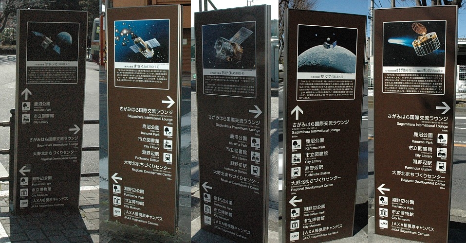 それぞれ看板に示された探査機の解説にも注目してください。 (写真左より:淵野辺駅側から順に「はやぶさ」「すざく」「あかり」「かぐや」「さきがけ/すいせい」の解説入り案内看板)